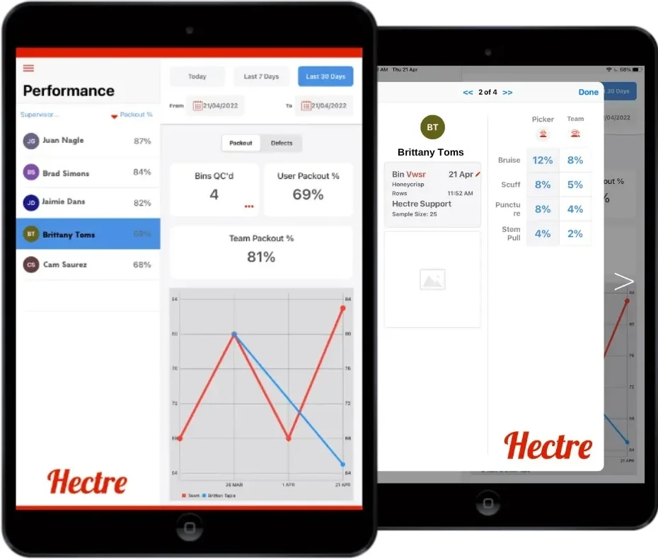 For evidence-based coaching for improved picker performance, you can take a photo with your iPad straight into the Hectre app and it will attach the photo to that QC sample. There is no hiding from data and evidence – there is no subjectivity either. The photo can show the problem and you can get it sorted.