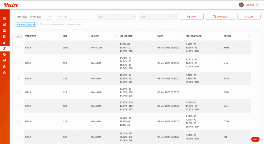 Integrated with the Spectre fruit sizing app, the Spectre Dashboard offers a comprehensive view of Spectre data. Users can access and download size and color distribution tables for multiple lots on a single page. With advanced search capabilities and filters, the Spectre Dashboard simplifies the utilization of early fruit size data, empowering growers and warehouse managers to make informed decisions.