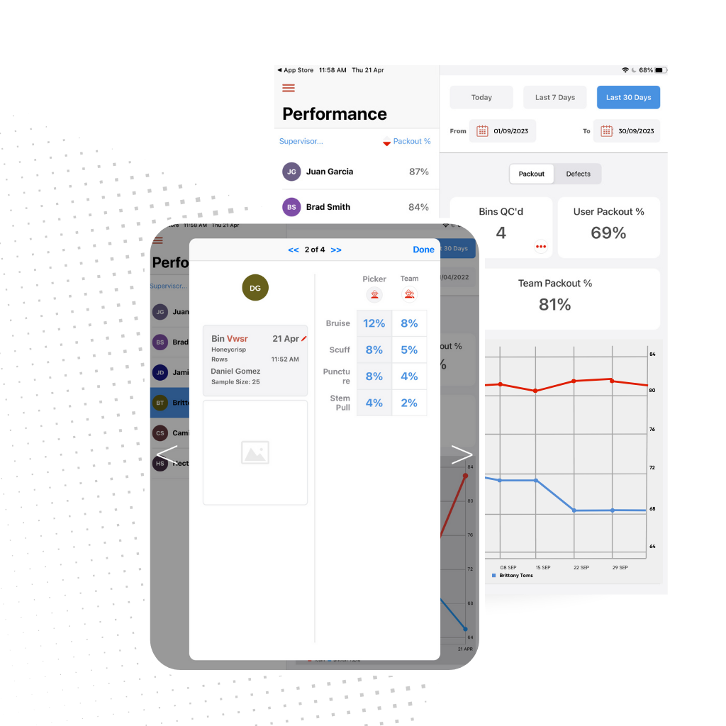 Typically, we have a QC person check about 25 apples per bin. They would check the apples for picking damage or defects and record their findings on paper QC sheets. Those QC sheets would accumulate, and then we’d need to go through them all to get an idea of what each picker was doing and look for outliers. Then it would go in the recycling bin.