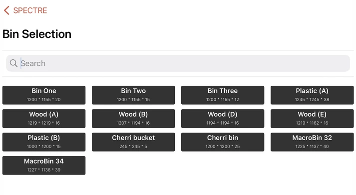 When searching for bin types when loading a new Spectre group, customers can now search for the name of the bin, or the dimensions of the bin. This enhancement makes it even easier and faster to find the right size bin you’re looking for when using Spectre for early-size and color information.