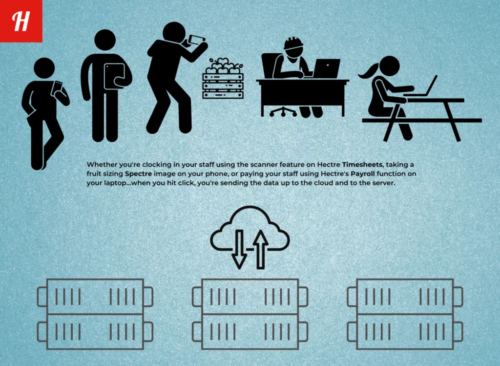 For example, when a Hectre customer uses Hectre’s Spectre tool to take a photo of a full fruit bin and hits “upload”, that image heads up to the cloud over the internet and lands on a server. Often those servers are housed at massive data centres in many locations around the world.